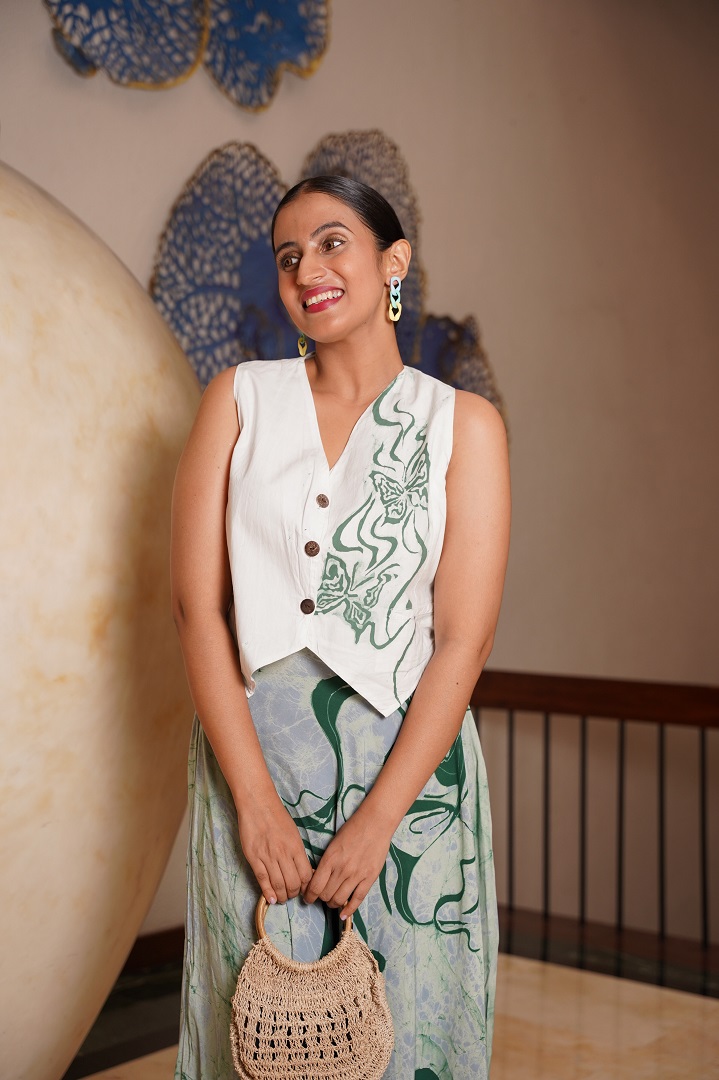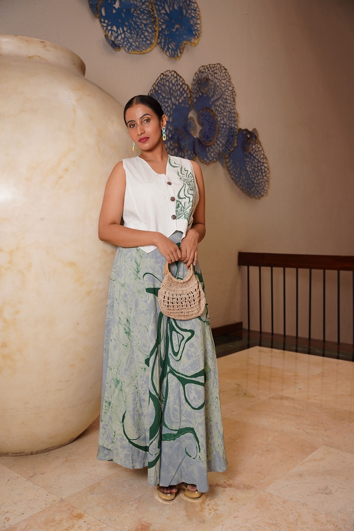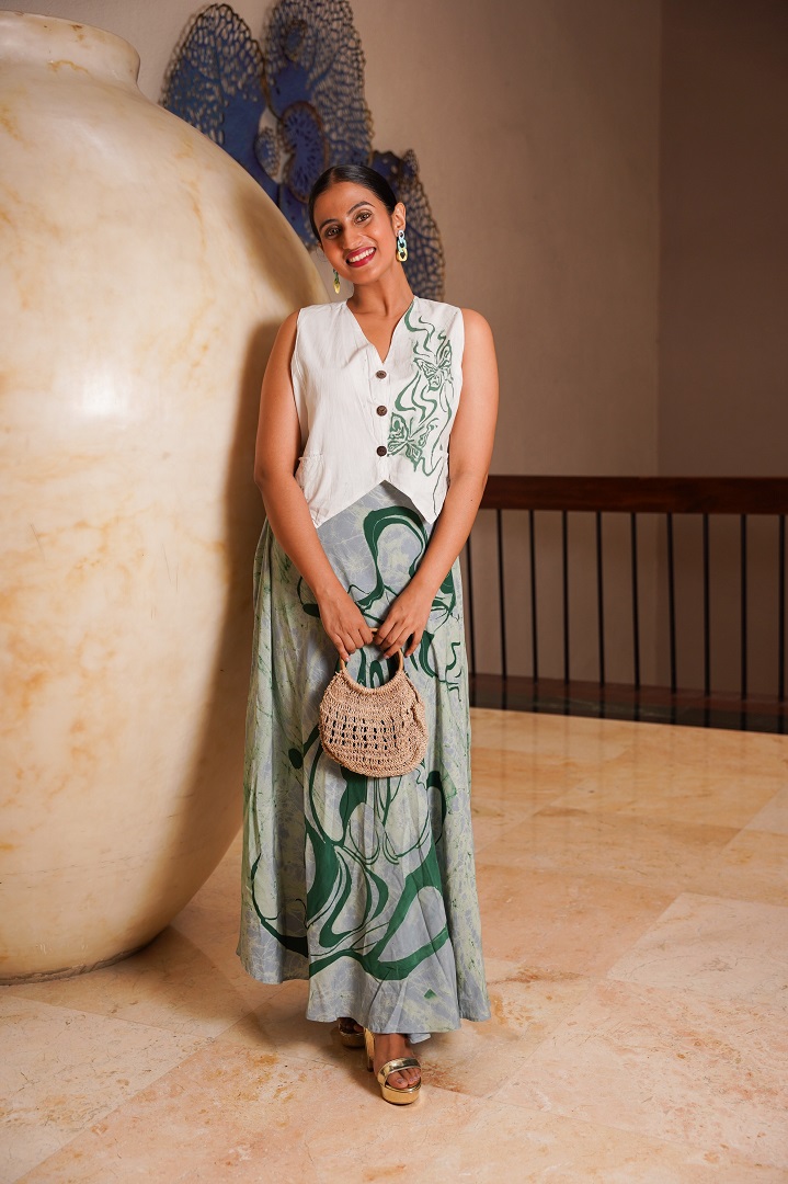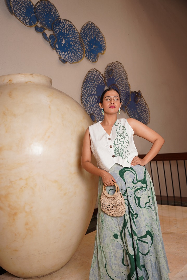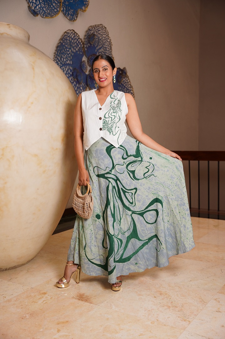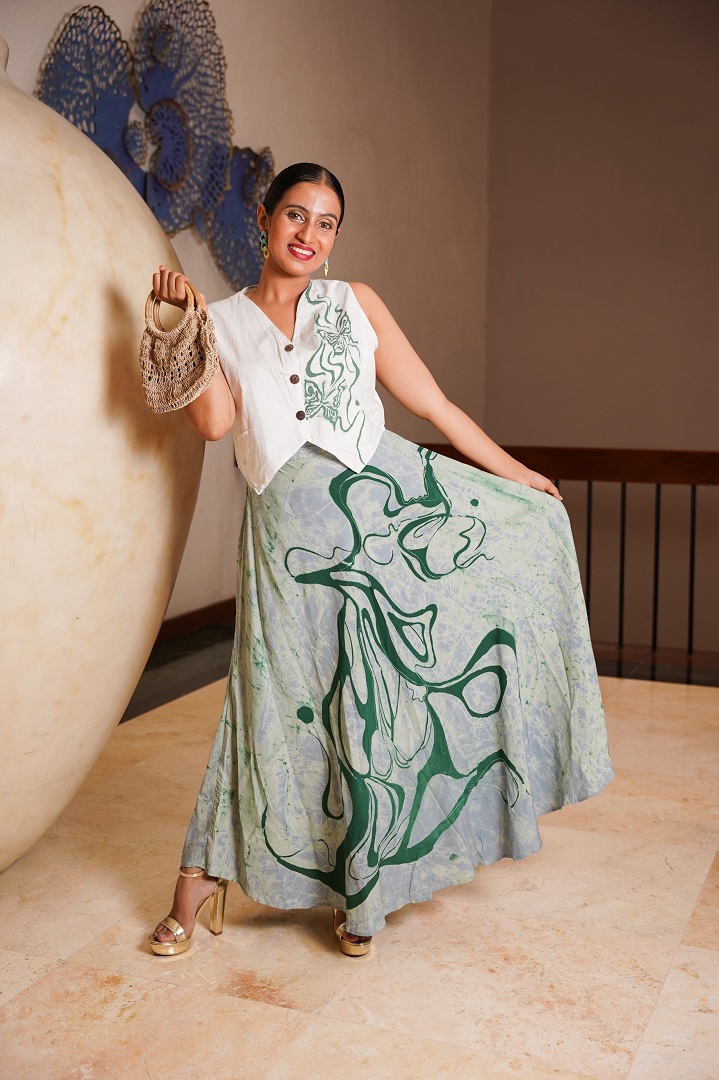 A bold statement piece, the Abstract Drift Skirt features uneven, abstract art patterns that flow with dynamic energy.
