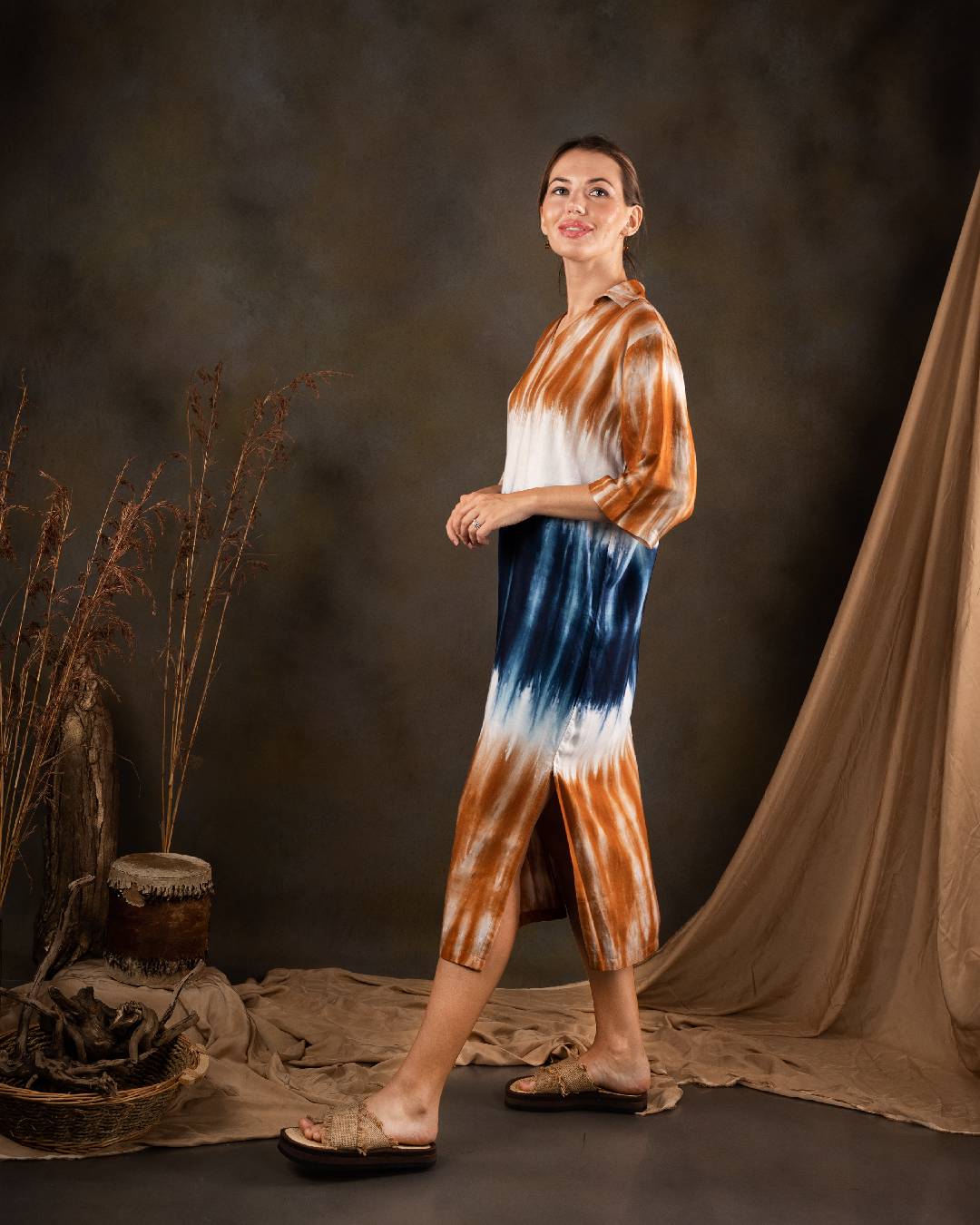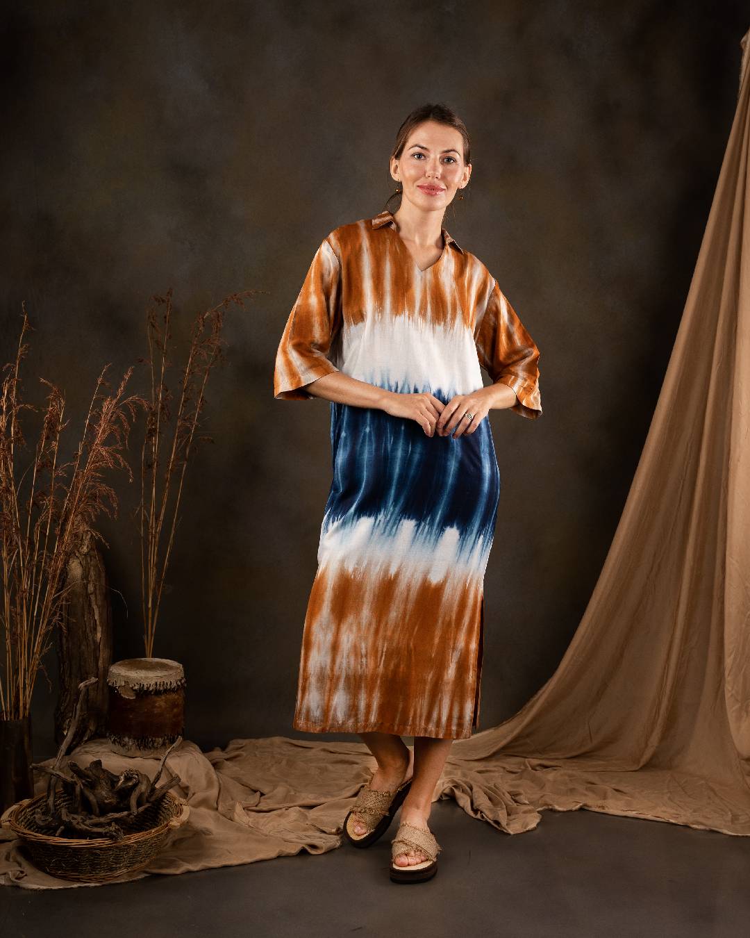 Sea and earth inspired tie and dye Long sleeve dress with comforn and elegance